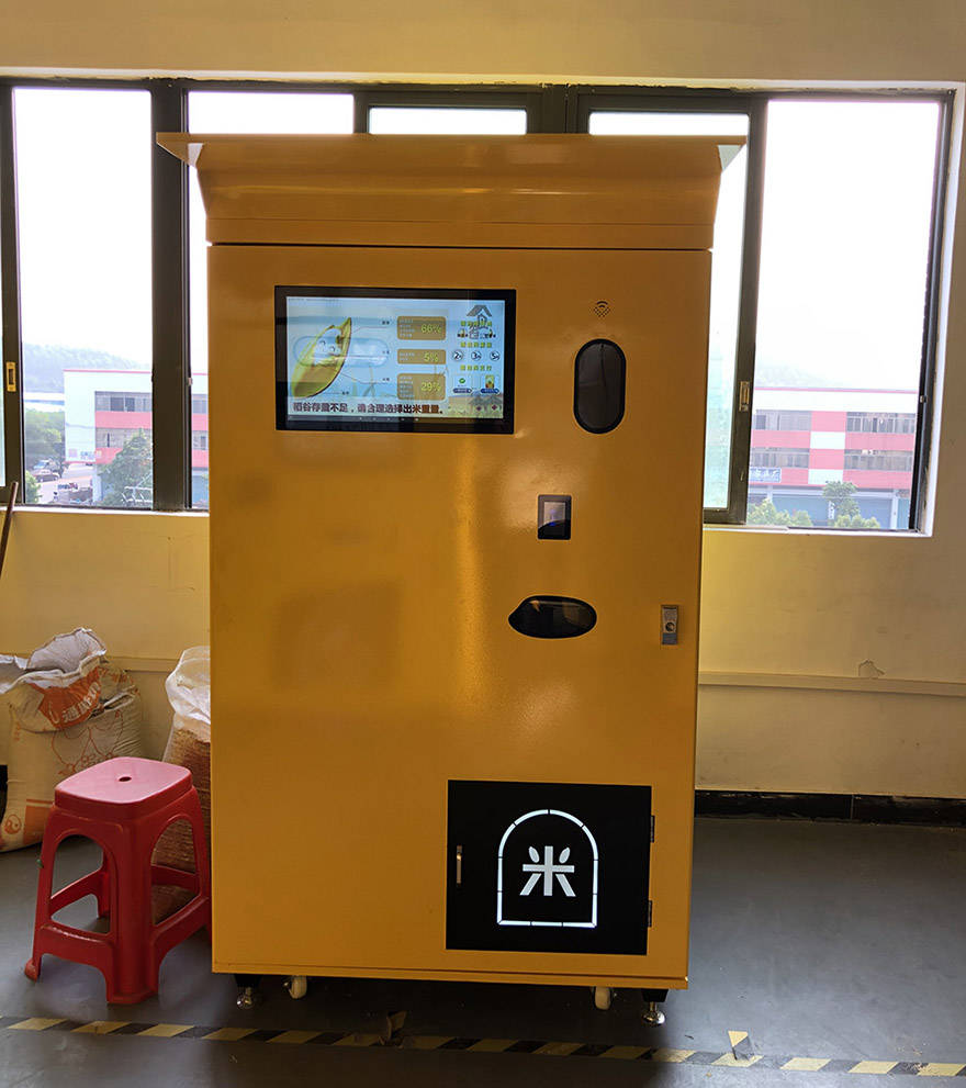 碾米机第八代· 24小时智能销售系统· 准确称重· 自动打米· 32寸大屏互动· 福马脚轮便捷移动· 微信支付/支付宝支付/会员卡支付· 工业烤漆,户外漆不生锈· 噪音小· 加工精度高· 不卡谷· 内部组件模块化· 取米门防碎· 胚芽率高· 自动打包· 一体电机
