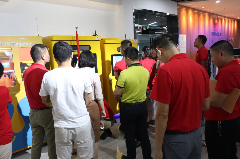 我们公司的总经理亲自接待,先带大家参观了下位于公司的展厅,展厅里摆放的都是我们的主打产品:有无人零售的自动售货机,还有鲜榨橙汁机,还有助力社会垃圾分类的智能垃圾分类回收机,还有我们的镇厂之宝“智能碾米机”,来自湖南商会的同僚都是社会各行各业的,有做地产,电子,纺织,还有服务业,面对这么多智能科技含量这么高的产品,都叹为观止……
