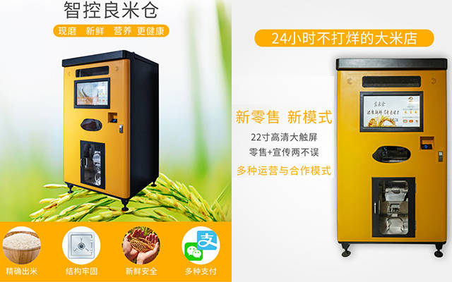 也正是其魅力所在。与其他自助售货机相比,智能碾米机并非是通过设备将成品的商品售卖出去,而是将稻谷加工和大米售卖的功能相结合。东吉良米仓“鲜米机”你了解吗?鲜米机主要由:碾磨系统、米糠收集系统(负压吸糠系统)、精度调节系统、动力系统和电器控制系统组成。通俗的说鲜米机就是把一整套加工稻谷的传统机械设备小型化集成到一起,所以通过一些调节同样可以加工其他的谷物。一键买米方便快捷。农业品牌,无风险,每一个家庭都有吃米的需求,并且越来越多的家庭对吃追求高品质!“新型智能碾米机”,对传统碾米机进行了开刀阔斧的升级改造,为消费者提供现碾现售的新鲜大米售卖模式,将大米加工环节后置,新的大米销售形态将上述问题得以解决。