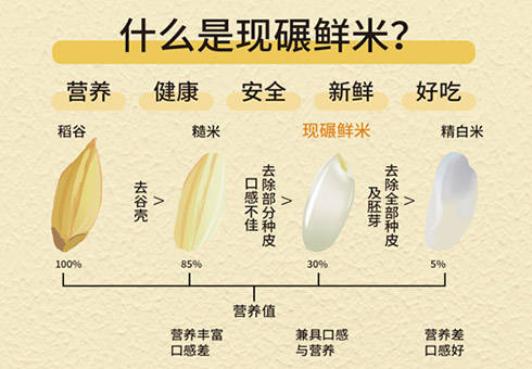 现碾米,是不经过抛光和打磨,稻谷脱壳后保留一些成分如糊粉层、胚芽的米,其口感类似农家米,油润有嚼劲,质地紧密,米香味浓,市面上现碾现售的米统称为鲜米。现碾米没有经过抛光、打蜡、染色、添加等危害食品安全工序,所以不存在"毒大米"等隐患。